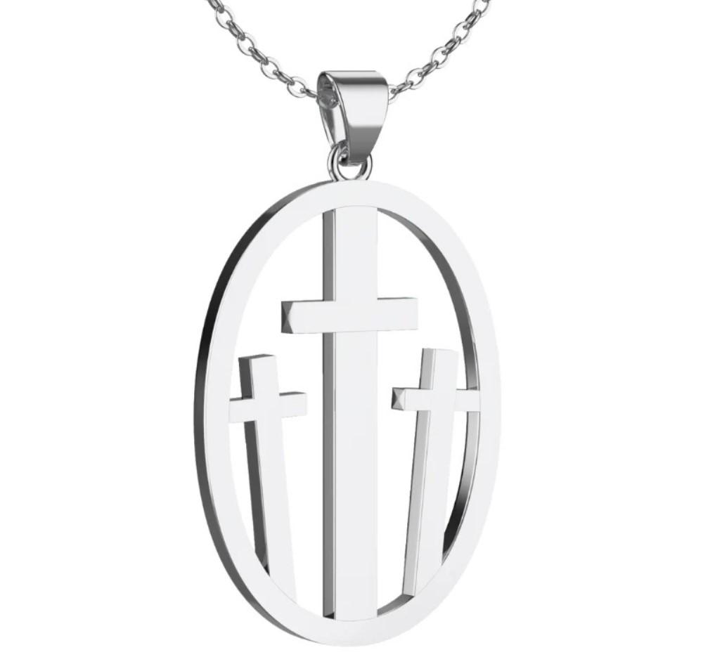Unveil the profound significance of the "At Calvary Necklace." This stainless steel pendant features an oval cutout with three crosses in the middle, each cross a poignant reminder of the price Jesus paid at Calvary.