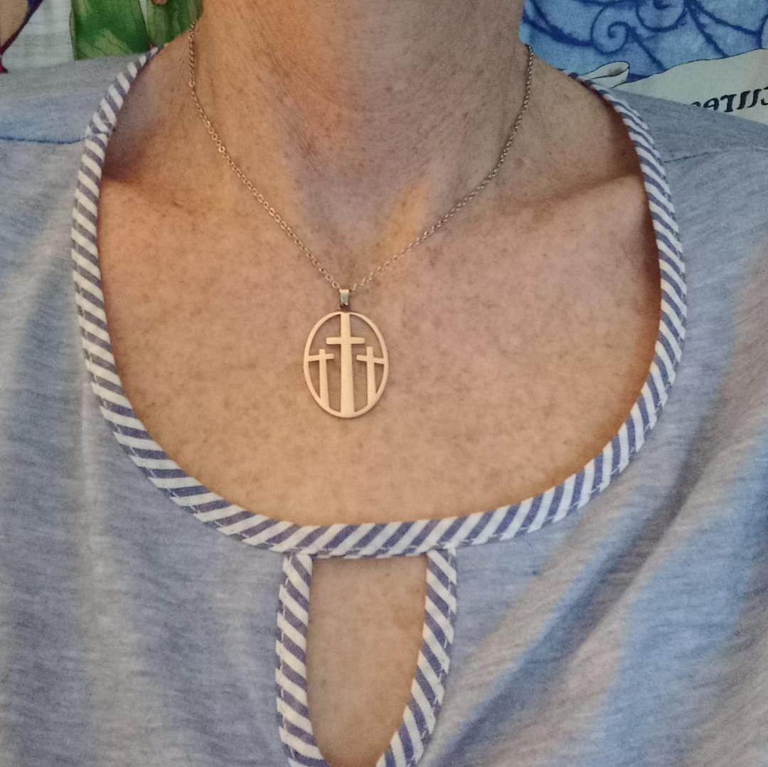"Love this three cross pendant. Reminds me of the old song The Old Rugged Cross. Brings back very good memories. Love it, very sturdy, just beautiful! Thank you again."