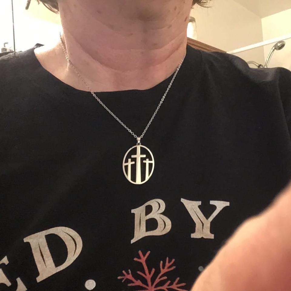 "Awesome necklace, silver 3-crosses. Good quality material and product. Nicely done."