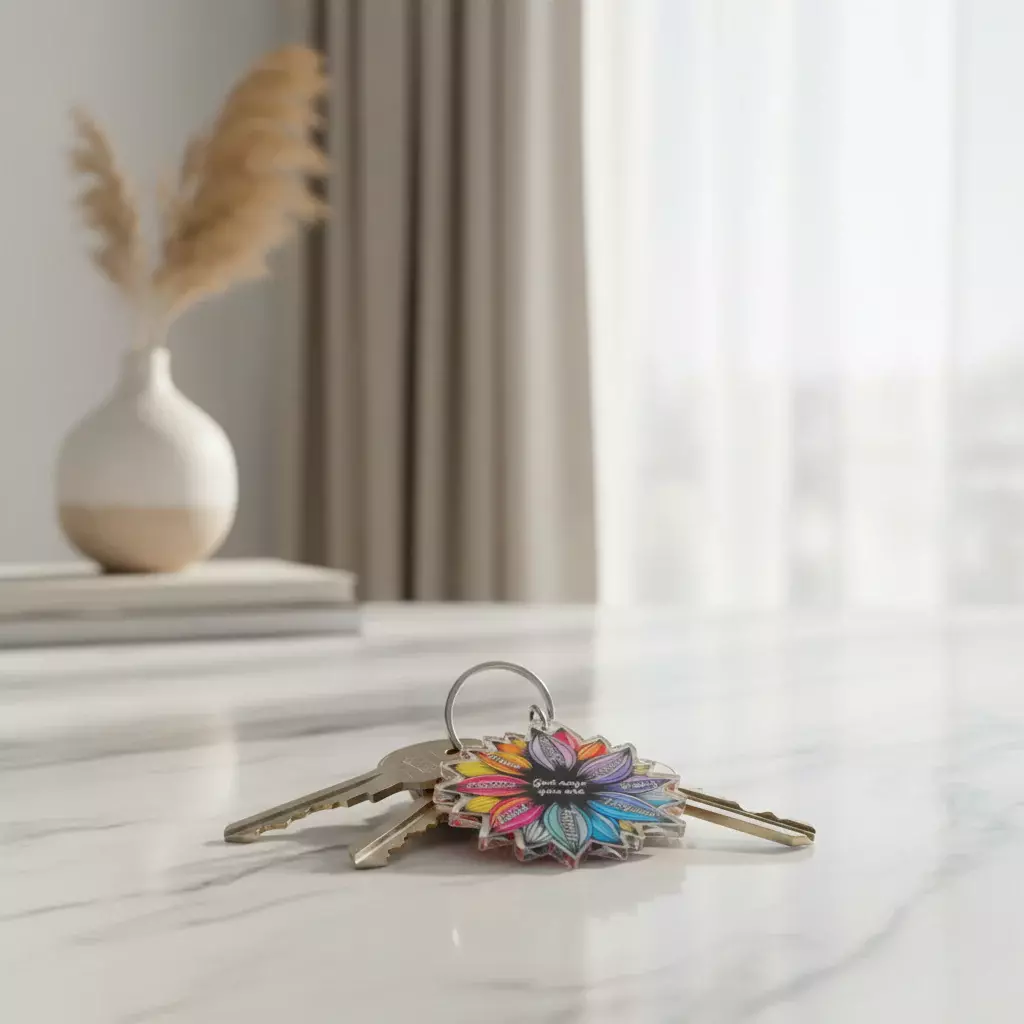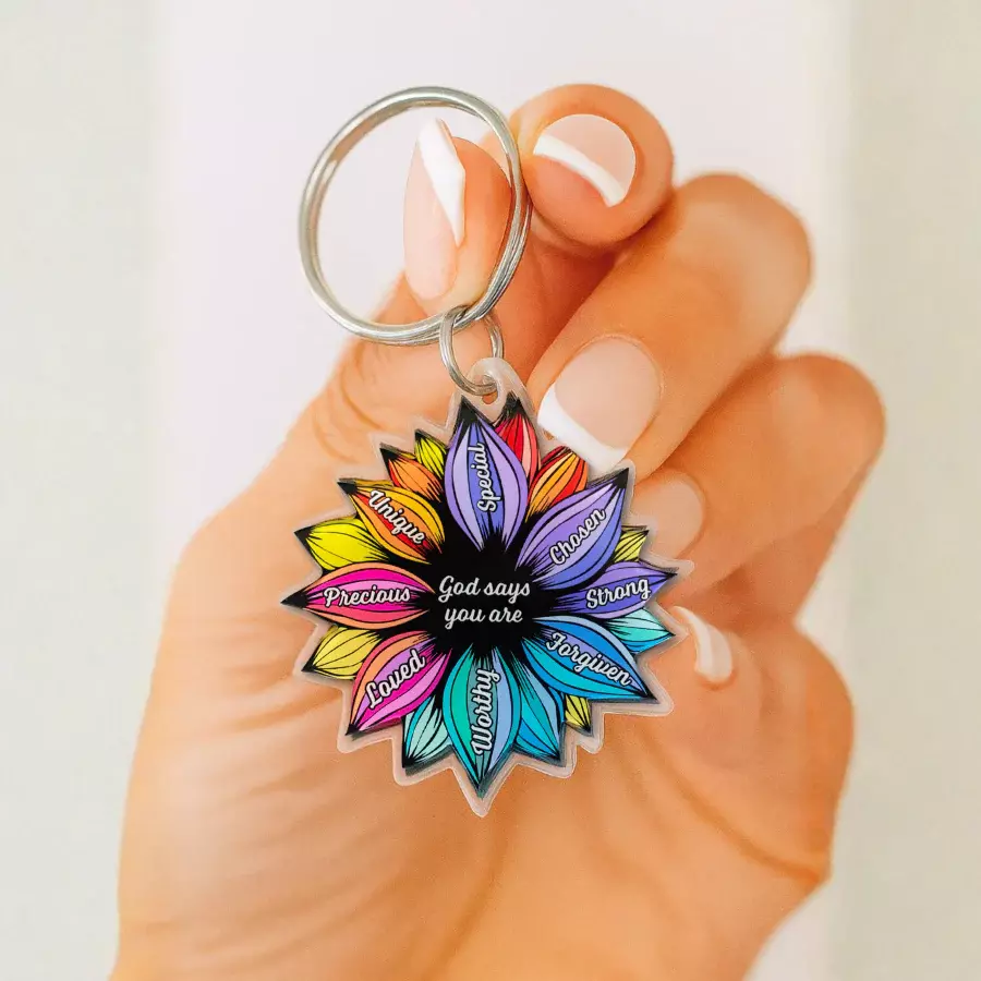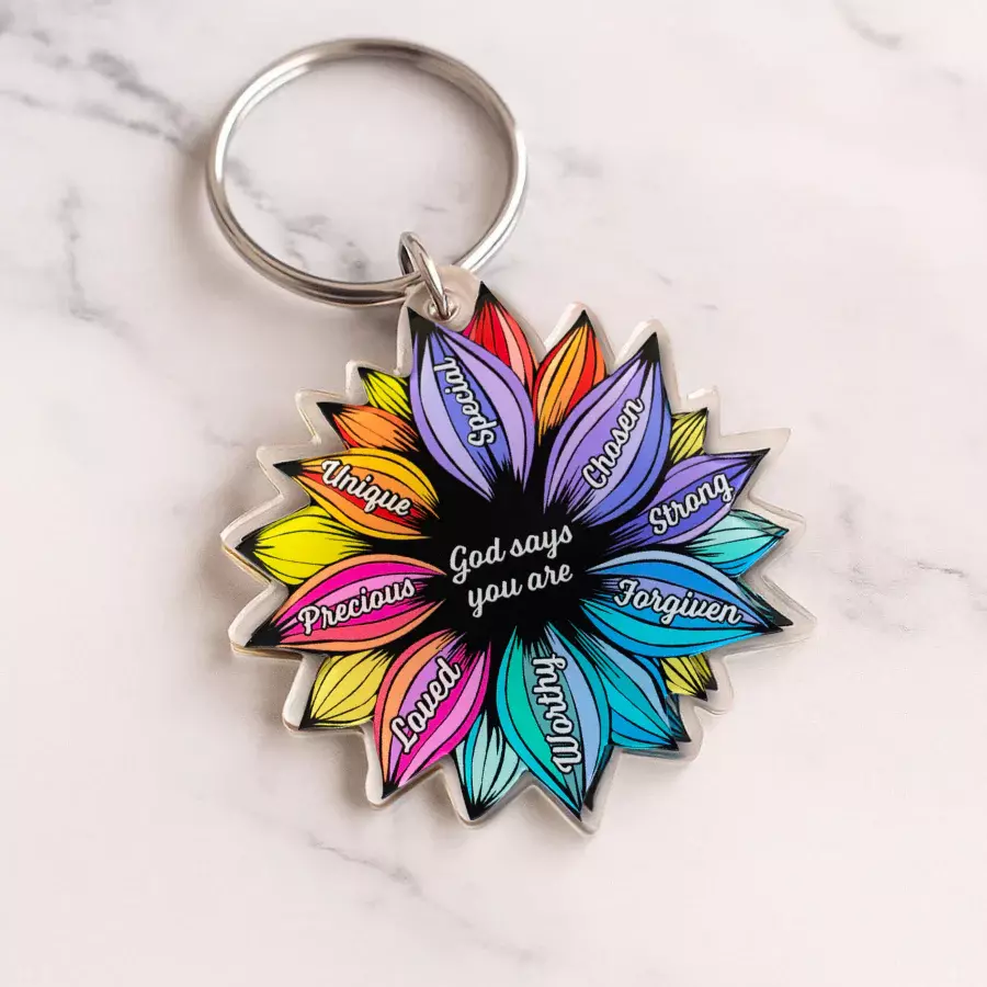 Celebrate who you are in Christ with this flower-shaped acrylic key chain, blooming with color and a message of true identity. Measuring approximately 1.7 inches wide and paired with a stainless steel key chain ring, it’s a joyful reminder of your worth in God’s eyes.