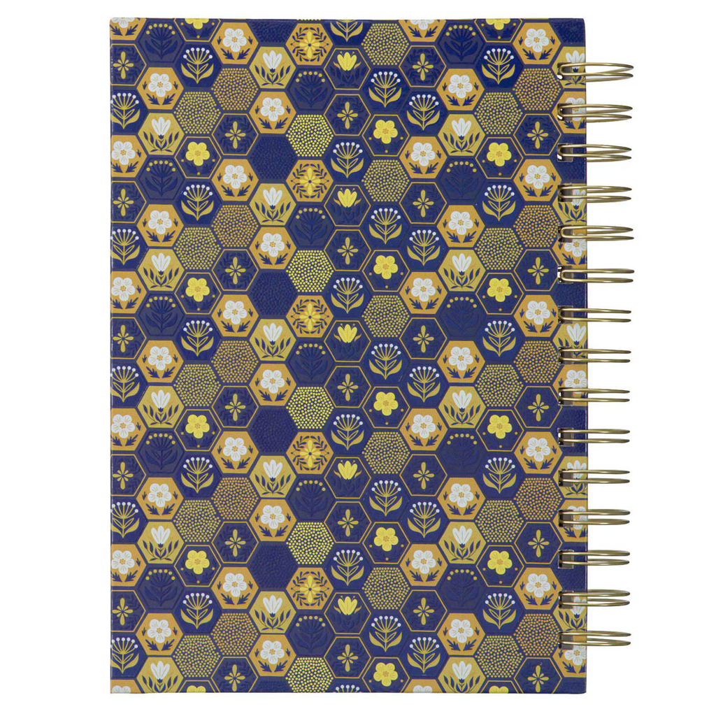 The back cover features an intricate navy blue honeycomb design filled with yellow, white, and gold-foiled flowers. Gold-toned metal wire binds the covers together.
