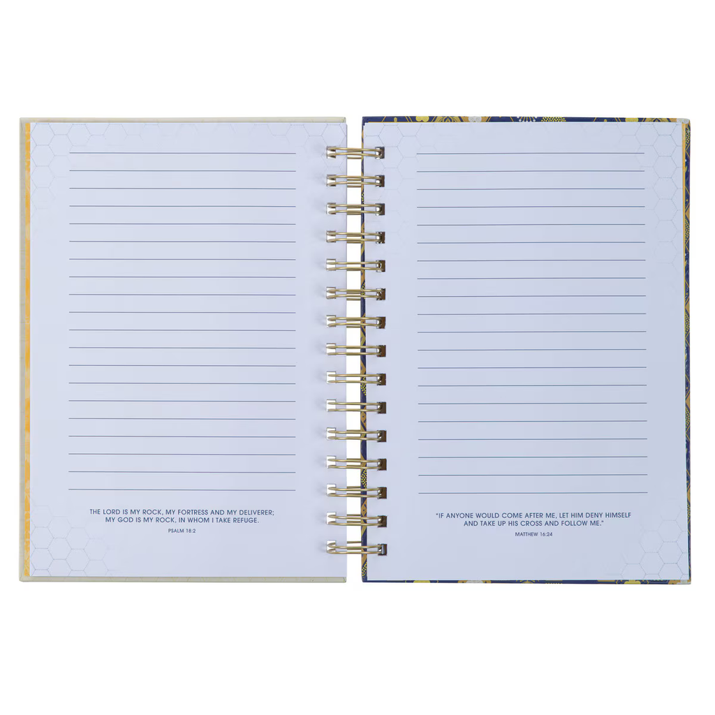 A faint gold-foiled honeycomb design adorns the creamy white front cover of the journal. The sentiment is presented in navy and gold-foiled letters that are framed by a yellow and blue floral swag at the top and the bottom. A gold-foiled bee crowns the design.