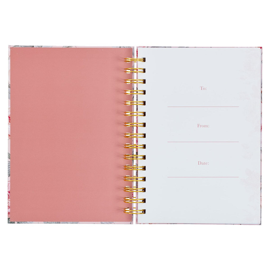 Pretty pink flowers bloom against a pink background on the covers of the wirebound journal. In the center, a white frame edged in pink holds the gold-foiled sentiment.