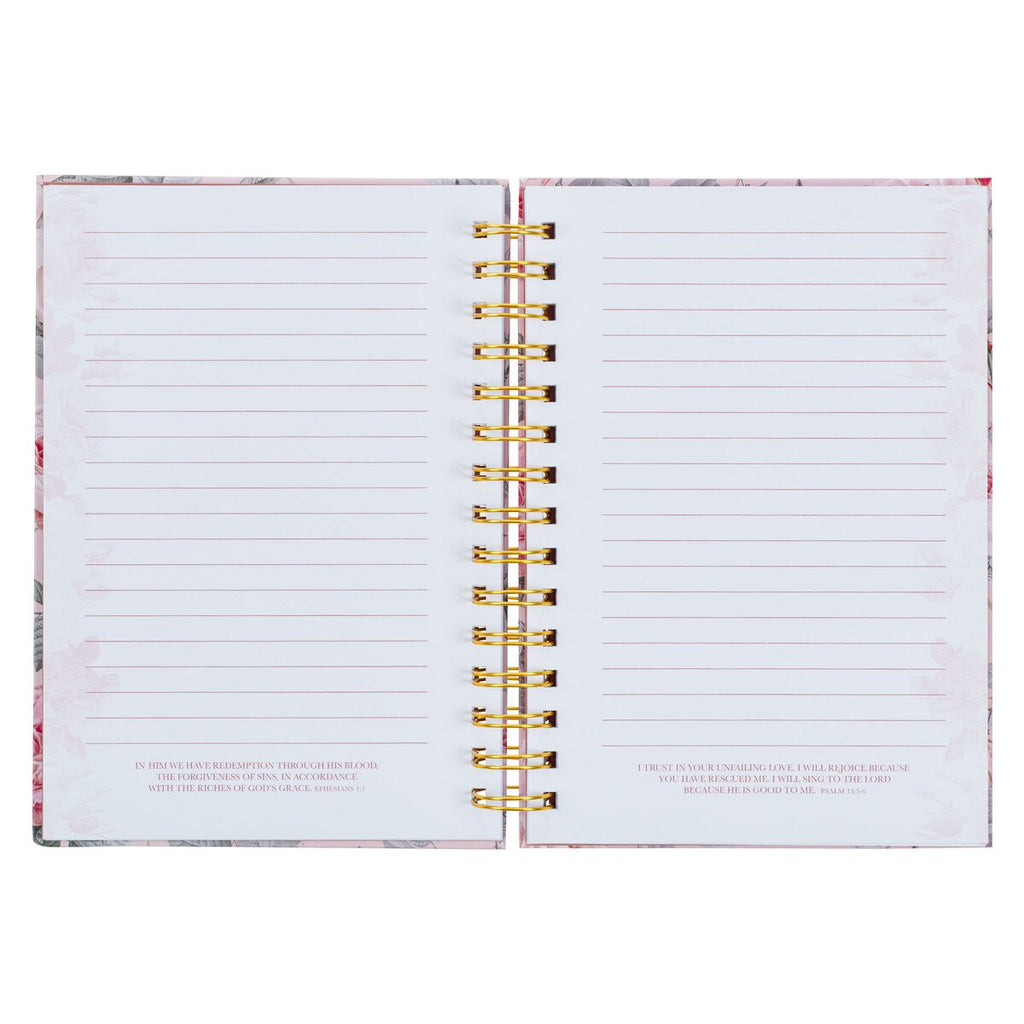 The gold-foiled wire binding harmonizes with the intricate floral design and the elegant gold-foiled accents to create unity throughout the design. Inside the journal, every page offers a meaningful Scripture verse printed at the bottom that could be used as a source of daily reflection. With 192 lined pages, the journal has ample space to express your thoughts and emotions. Each page is decorated with a pink watermarked floral design along the outer edge. The journal also features a presentation page at the front, which can be personalized when it is given as a gift.
